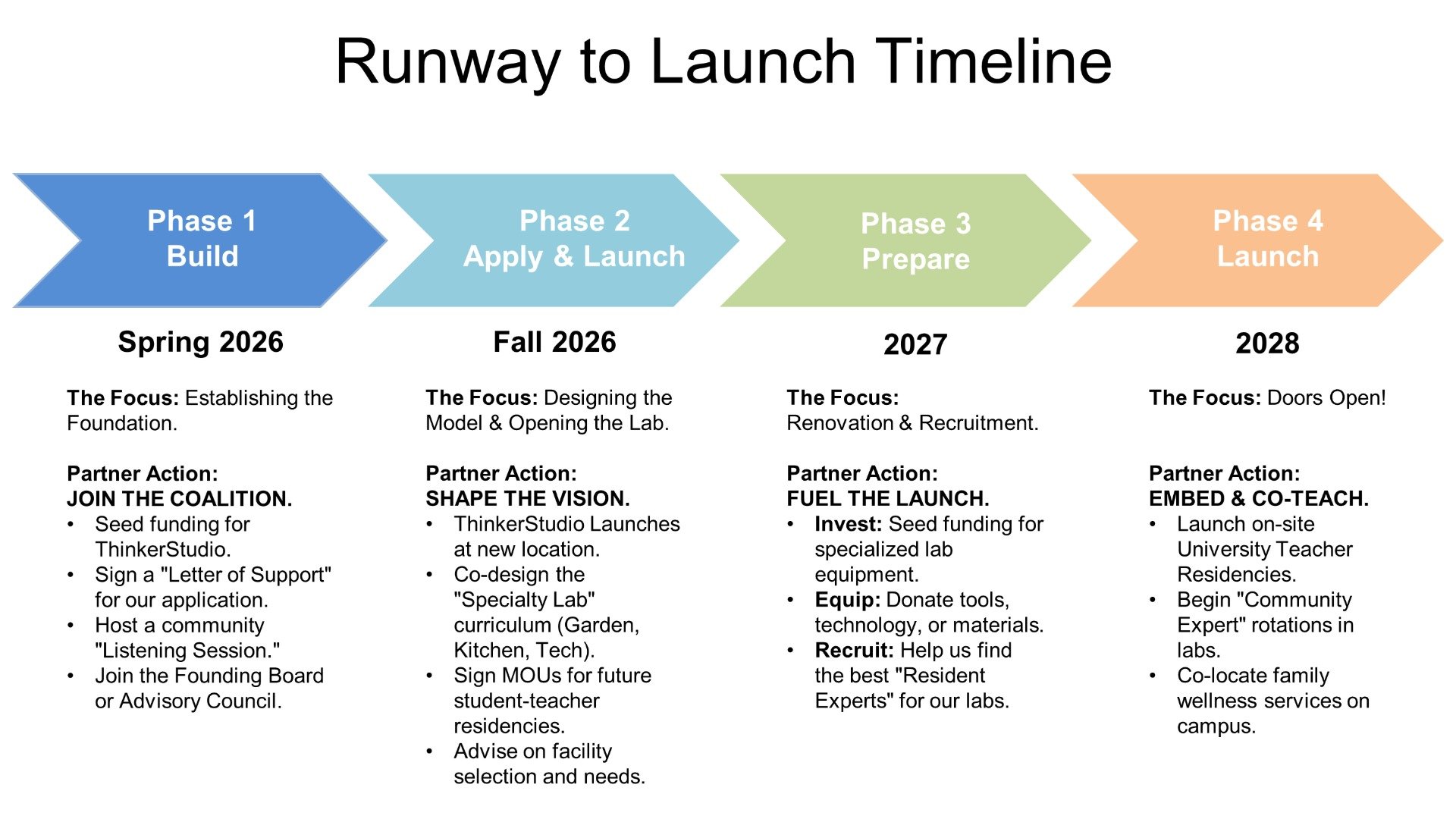 Phase 1: Build (Spring 2026) – Join the Coalition We are currently laying the foundation—establishing our non-profit status, forming our founding board, and embarking on a comprehensive Listening Tour to ensure our school reflects the community's voice. This is the time for initial partnerships and strategic alignment.